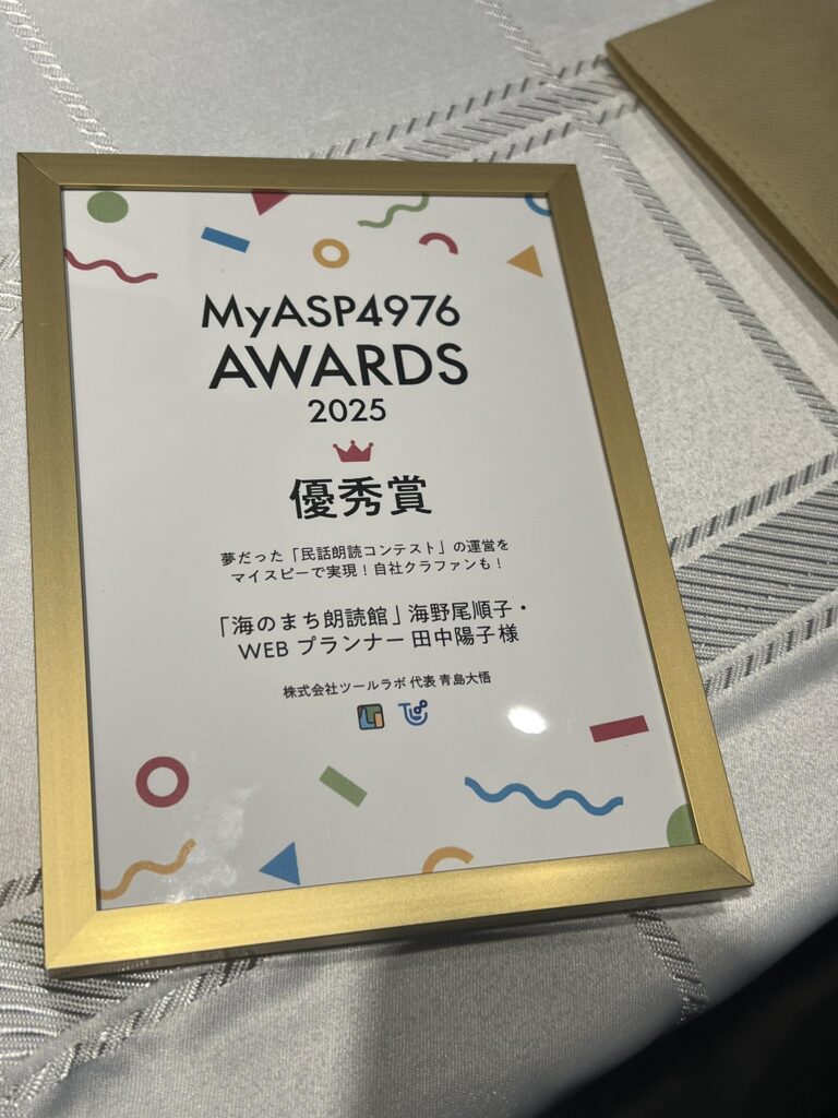 オールインワンマーケティングツール「Myasp」さんの2025「よくなる4976 祭」にて活用事例で受賞いたしました! 2023年よりシステム構築をお任せいただいています海のまち朗読館さま「民話朗読コンテスト」の応募システム・自社クラファンシステムをMyasp... -